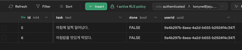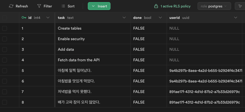 - todos 테이블 생성 후 샘플 데이터도 넣고, anon 정책도 적용한다.