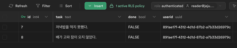 - 대시보드 테이블 메뉴에서 role 선택하며 데이터 접근 테스트 (auth.uid()=manager)