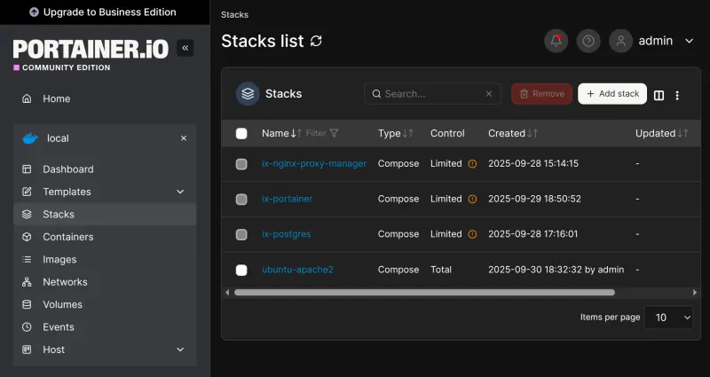 Portainer 에서 실행된 ubuntu-apache2 스택